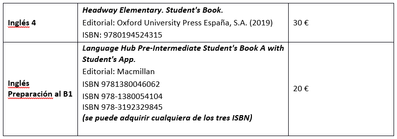 Inglés Preparación B1 Mañanas: Martes y Viernes de 11:00 a 12:00 horas, y Jueves de 12:00 a 13:00 horas.